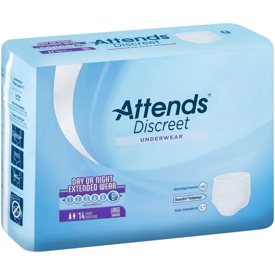 Attends Discreet Underwear is an Overnight Extended Wear disposable incontinence product. It contains additional super absorbent polymer and cellulous fibers for 50% more absorbency than traditional protective underwear.